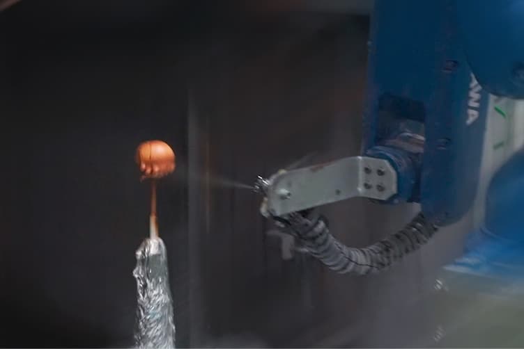 グラデーション塗装ロボットと同様に、自働丸吹き装置を自社開発し、ムラの無い均一な塗装を実現しています。